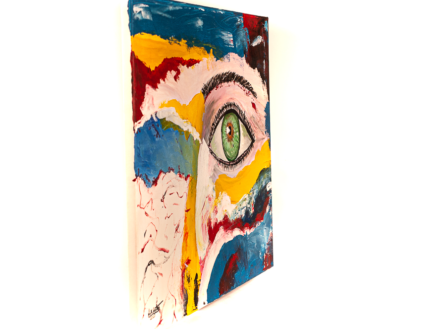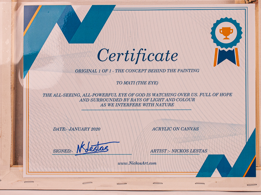 | το μάτι (The Eye) ORIGINAL 1 OF 1 – THE CONCEPT BEHIND THE PAINTING The all-seeing, all-powerful, eye of God is watching over us full of hope and Surrounded by rays of light and colour as we interfere with Mother Nature. DATE:- January 2020 ACRYLIC ON CANVAS Size:- 60cm x 50cm Price £320 ARTIST :- Nickos Lestas |
