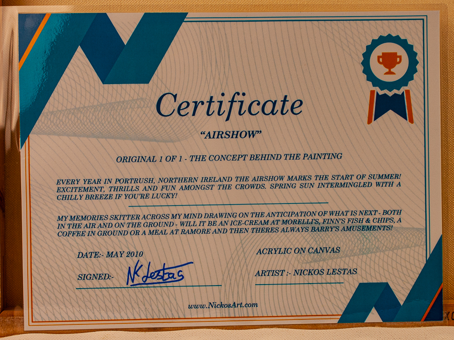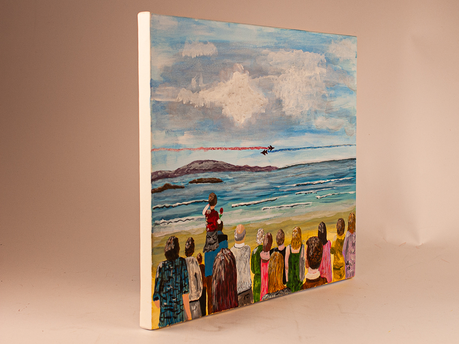 | “Airshow” ORIGINAL 1 OF 1 – THE CONCEPT BEHIND THE PAINTING Every year in Portrush, Northern Ireland the Airshow marks the start of summer! Excitement, thrills and fun amongst the crowds. spring sun intermingled with a chilly breeze if you’re lucky! My memories skitter across my mind drawing on the anticipation of what is next – both in the air and on the ground – will it be an ice-cream at Morelli’s, Finn’s Fish & Chips, a coffee in Ground or a meal at Ramore and then theres always Barry’s Amusements! DATE:- May 2010 ACRYLIC ON CANVAS Size:- 50cm x 40cm Price £280 ARTIST :- Nickos Lestas |