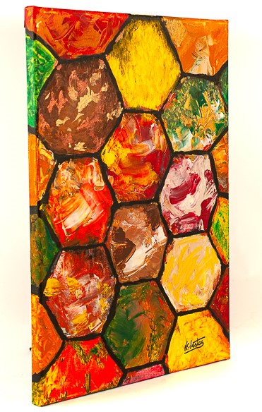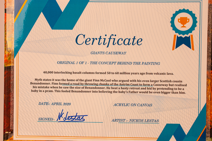 | giants causeway ORIGINAL 1 OF 1 – THE CONCEPT BEHIND THE PAINTING 40,000 interlocking basalt columns formed 50 to 60 million years ago from volcanic lava. Myth states it was the home of the giant Finn McCool who argued with his even larger Scottish cousin Benandonner. Finn formed a road by throwing chunks of the Antrim Coast to form a Causeway but realised his mistake when he saw the size of Benandonner. He beat a hasty retreat and hid, by pretending to be a baby in a pram. This fooled Benandonner into believing the baby’s Father would be even bigger than him. DATE:- APRIL 2020 ACRYLIC ON CANVAS Size:- 40cm x 30cm Price:- £160 ARTIST :- Nickos Lestas |