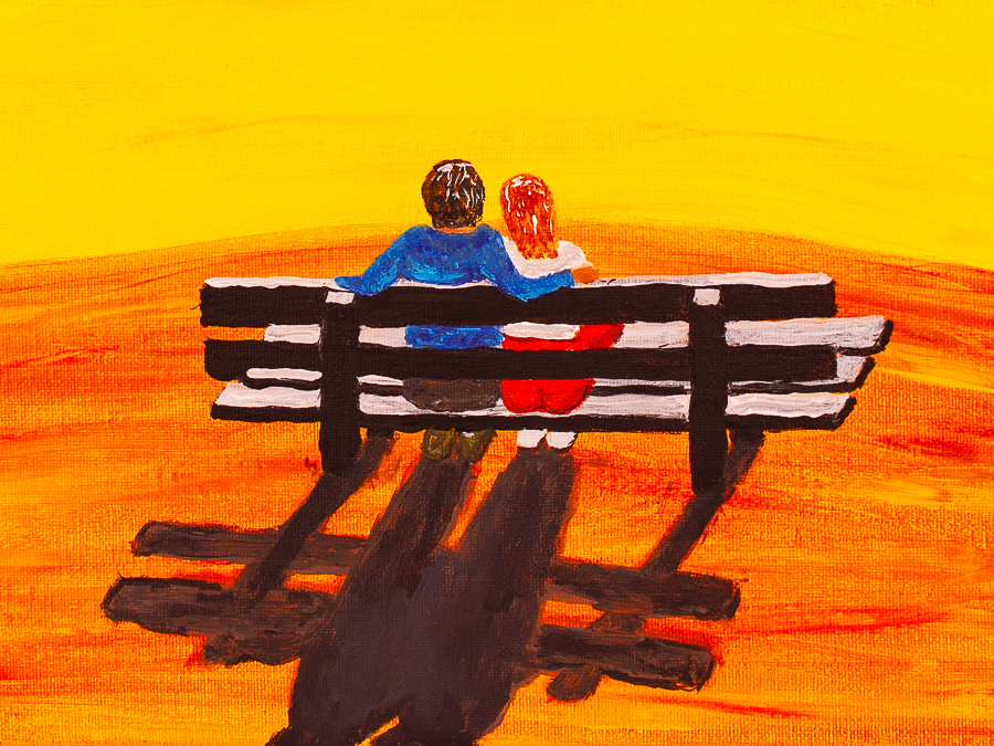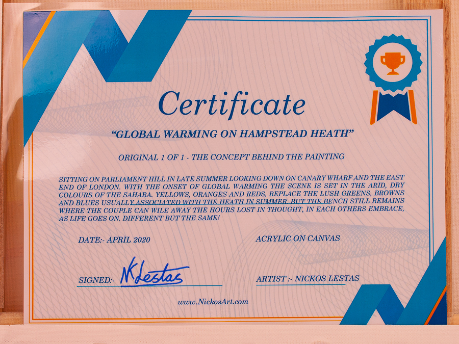 | Global Warming on Hampstead Heath ORIGINAL 1 OF 1 – THE CONCEPT BEHIND THE PAINTING Sitting on parliament hill in late summer looking down on canary wharf and the east end of London. With the onset of global warming the scene is set using the arid, dry colours of the Sahara. Yellows, oranges and reds, replace the lush greens, browns and blues usually associated with the heath in summer. But the bench still remains where the couple can wile away the hours lost in thought, in each others embrace, as life goes on. Different but the same! DATE:- April 2020 ACRYLIC ON CANVAS Size:- 60cm x 50cm Price £290 ARTIST :- Nickos Lestas |