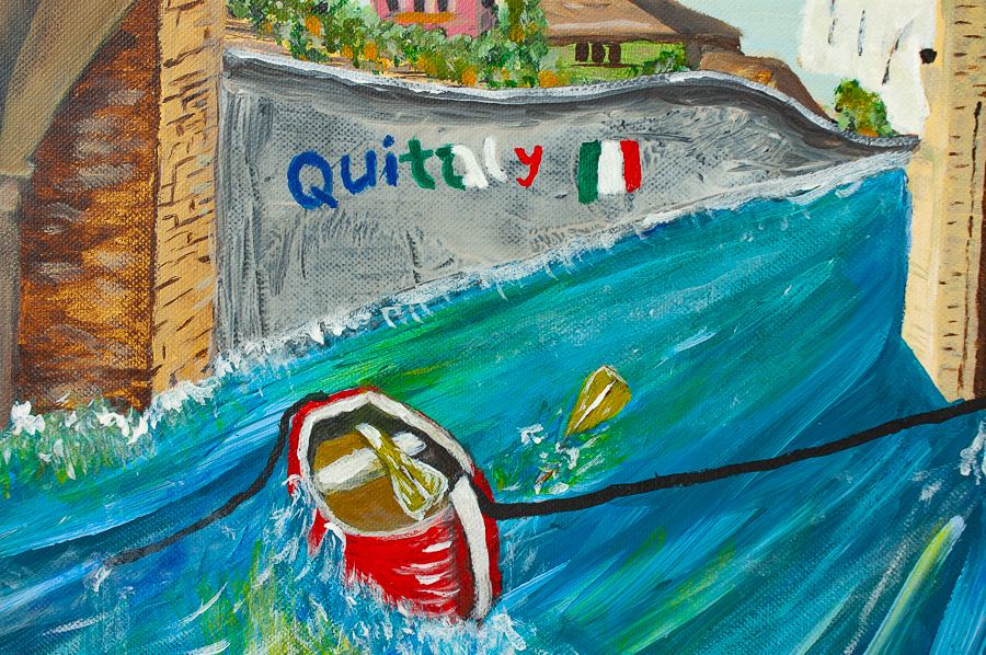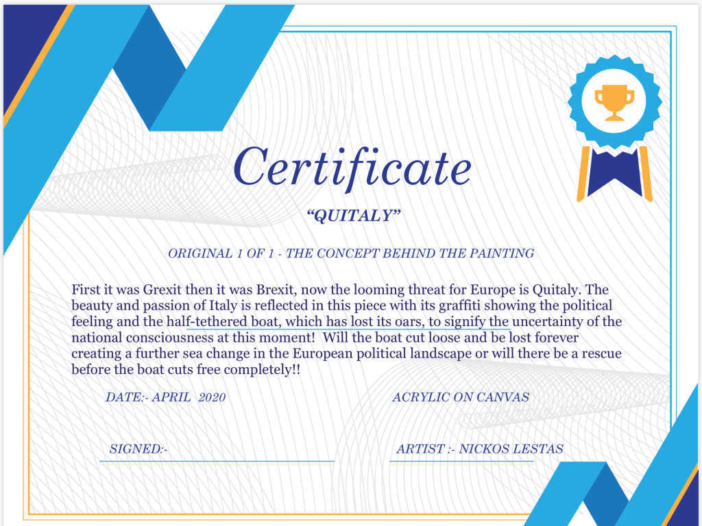| QUITALY ORIGINAL 1 OF 1 – THE CONCEPT BEHIND THE PAINTING First it was Grexit then it was Brexit, now the looming threat for Europe is Quitaly. The beauty and passion of Italy is reflected in this piece with its graffiti showing the political feeling and the half-tethered boat, which has lost its oars, to signify the uncertainty of the national consciousness at this moment! Will the boat cut loose and be lost forever creating a further sea change in the European political landscape or will there be a rescue before the boat cuts free completely!! DATE:- April 2020 ACRYLIC ON CANVAS Size:- 50cm x 40cm x 2cm Price £190 ARTIST :- Nickos Lestas |