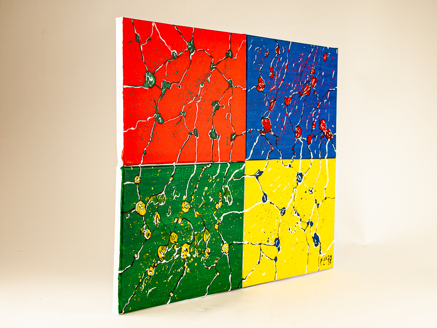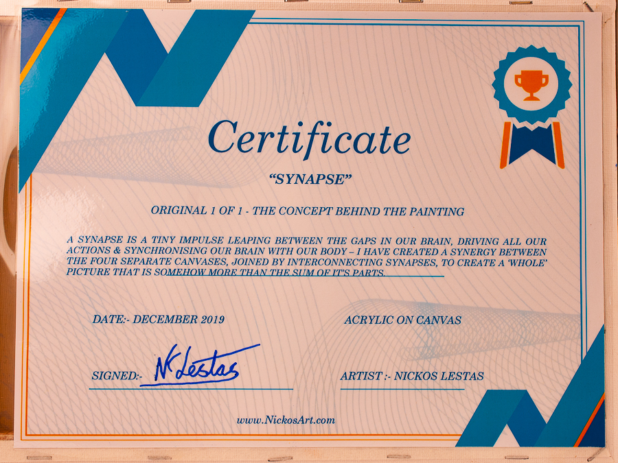 | Synapse ORIGINAL 1 OF 1 – THE CONCEPT BEHIND THE PAINTING A synapse is a tiny impulse leaping between the gaps in our brain, driving all our actions & synchronising our brain with our body. I have created a synergy between the four separate canvases, joined by interconnecting synapses, to create a ‘whole’ picture that is somehow ‘more than the sum of it’s parts’. DATE:- December 2019 ACRYLIC ON 4 CANVAS’s (joined) Size:- 60cm x 45cm Price £320 ARTIST :- Nickos Lestas |