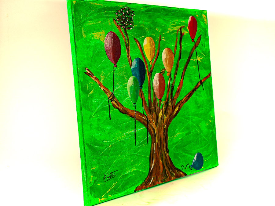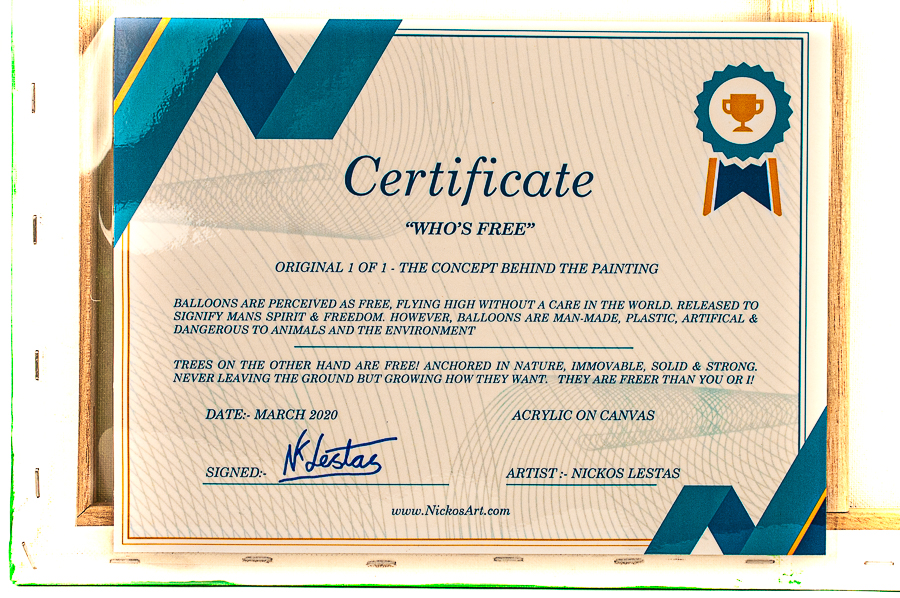 | “Who’s free” ORIGINAL 1 OF 1 – THE CONCEPT BEHIND THE PAINTING Balloons are perceived as free, flying high without a care in the world. Released to signify mans spirit & freedom. BUT, balloons are man-made, plastic, artificial and dangerous to animals and the environment. Trees on the other hand are free! Anchored in nature, immovable, solid & strong. Never leaving the ground but growing how they want. They are FREER than you or I! DATE:- March 2020 ACRYLIC ON CANVAS Size:- 60cm x 50cm Price £290 ARTIST :- Nickos Lestas |